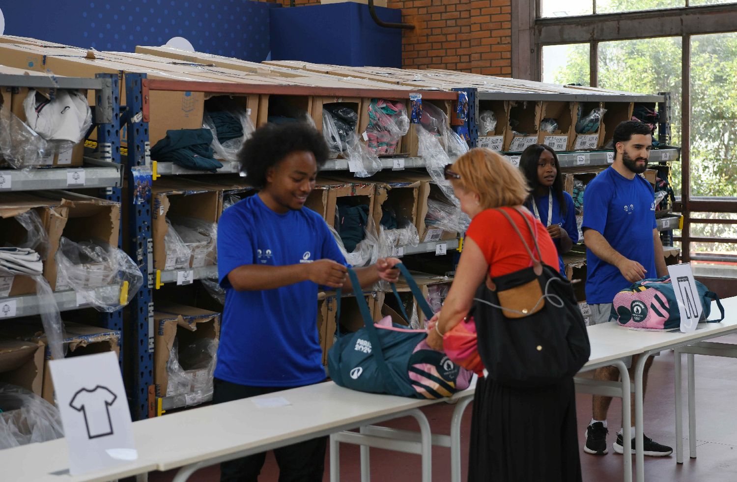 当地时间7月24日,在巴黎奥运志愿者装备分发中心内,工作人员在为志愿者分发装备。图/中新社