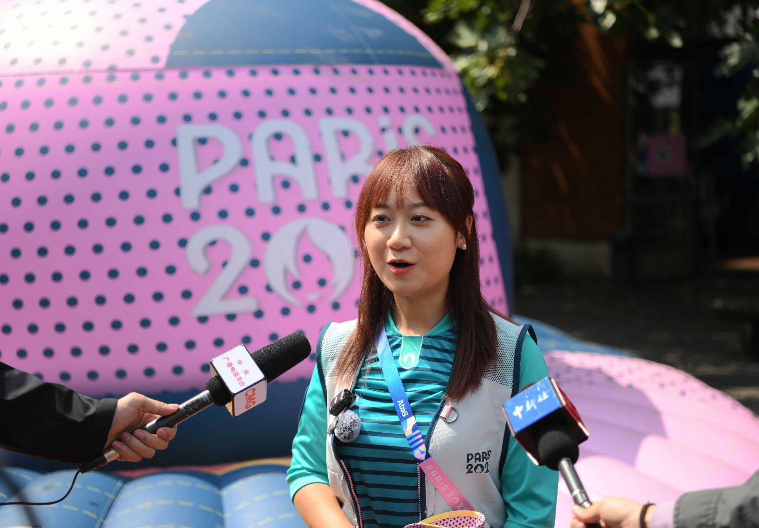 当地时间7月24日,巴黎奥运会的中国志愿者易铎楠展示她的志愿者装备并接受采访。图/中新社