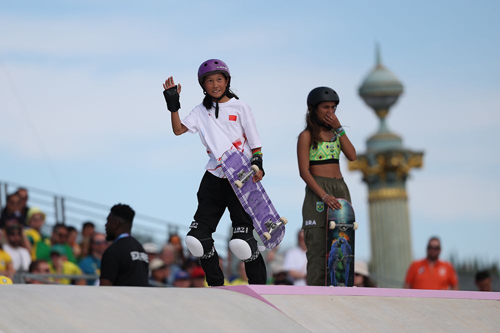 当地时间7月28日,巴黎奥运会滑板女子街式赛决赛在巴黎协和广场进行,图为崔宸曦(左)挥手致意。图/中新社