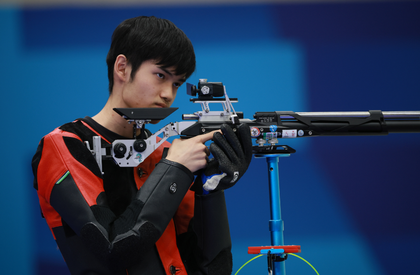 当地时间7月29日,盛李豪在比赛中。当日,在法国沙托鲁举行的巴黎奥运会射击男子10米气步枪决赛中,中国选手盛李豪获得冠军。