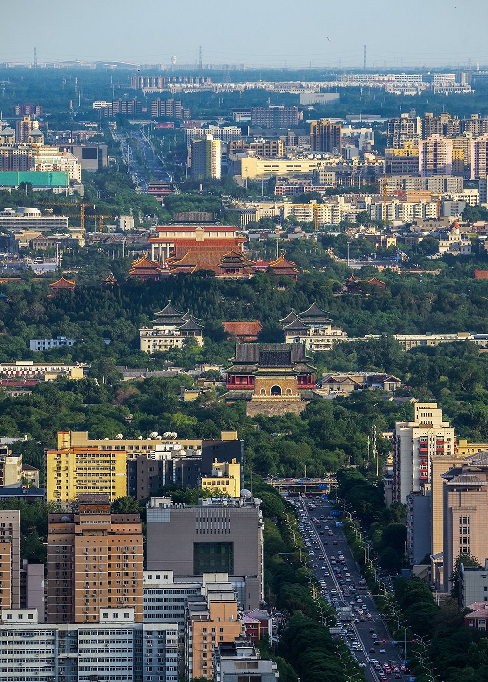 图为远眺“北京中轴线”,从近到远分别是钟鼓楼、景山、故宫、天安门、正阳门和永定门等主要遗产构成要素。图/中新社