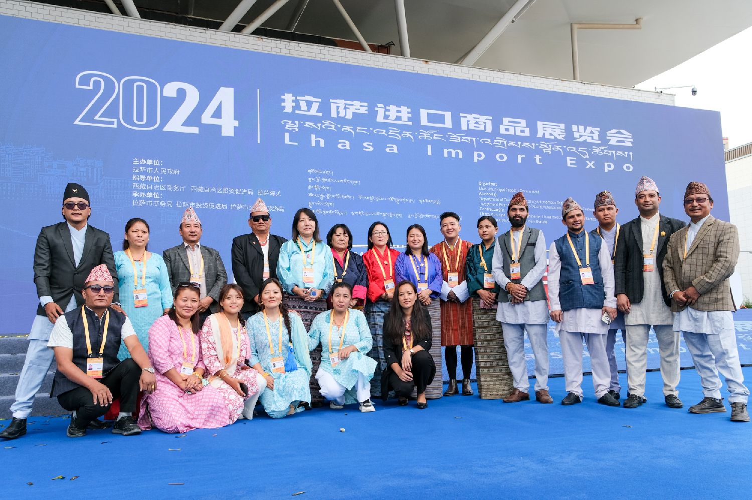 8月4日,来自尼泊尔和不丹的参展商在拉萨进口商品展览会开幕式现场合影留念。图/中新社