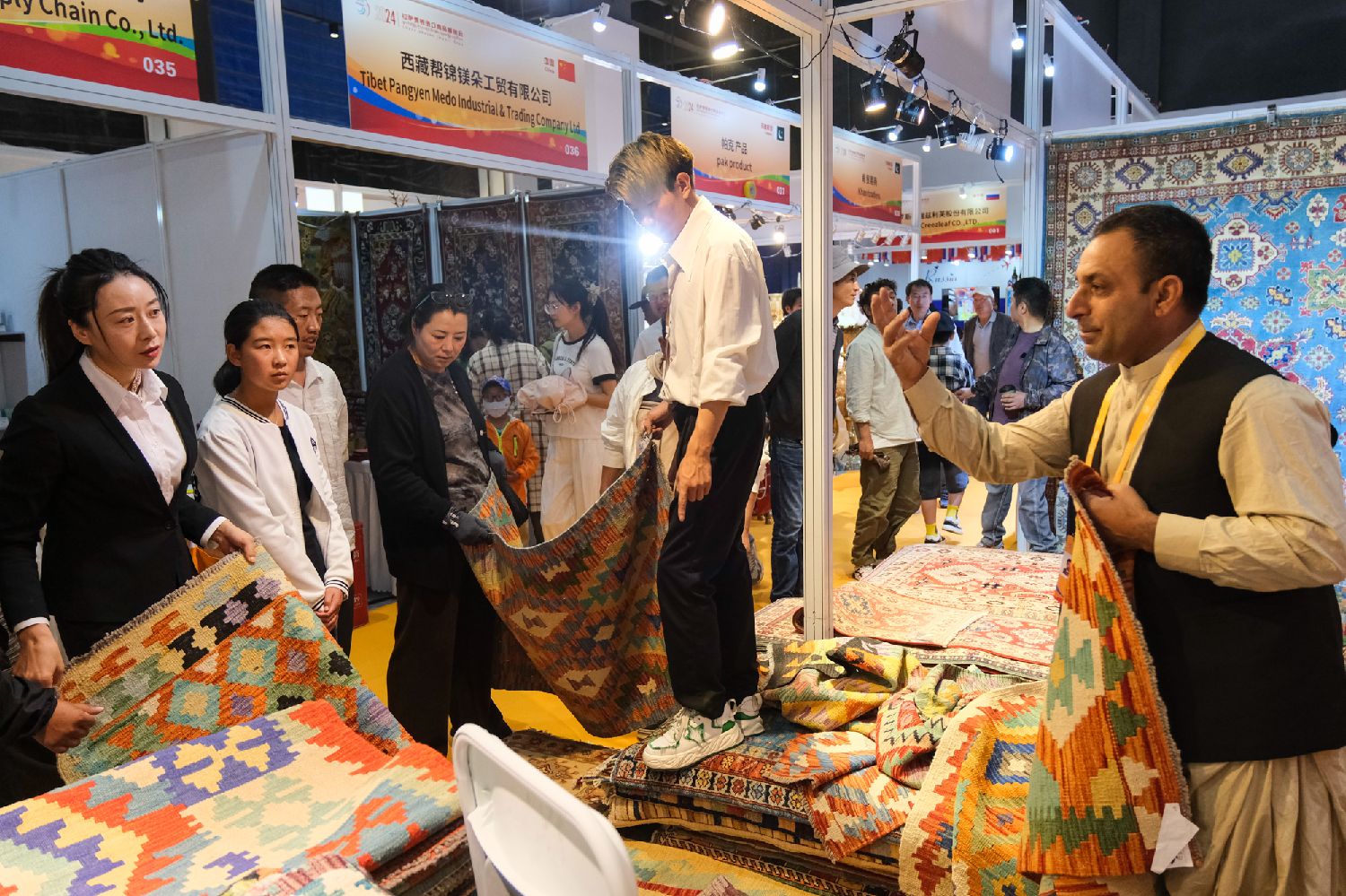 来自阿富汗喀布尔的商人阿明扎伊·穆罕默德·贾(Aminzai Mohammad Jan)主要销售阿富汗毛毯等手工艺品,这是他第二次进藏展销。现场,阿明扎伊·穆罕默德·贾十分忙碌,不断为顾客挑选合适的款式和花色,顾客砍价时,他便掏出手机播放毛毯的制作过程。他说,期待这次销量更好。