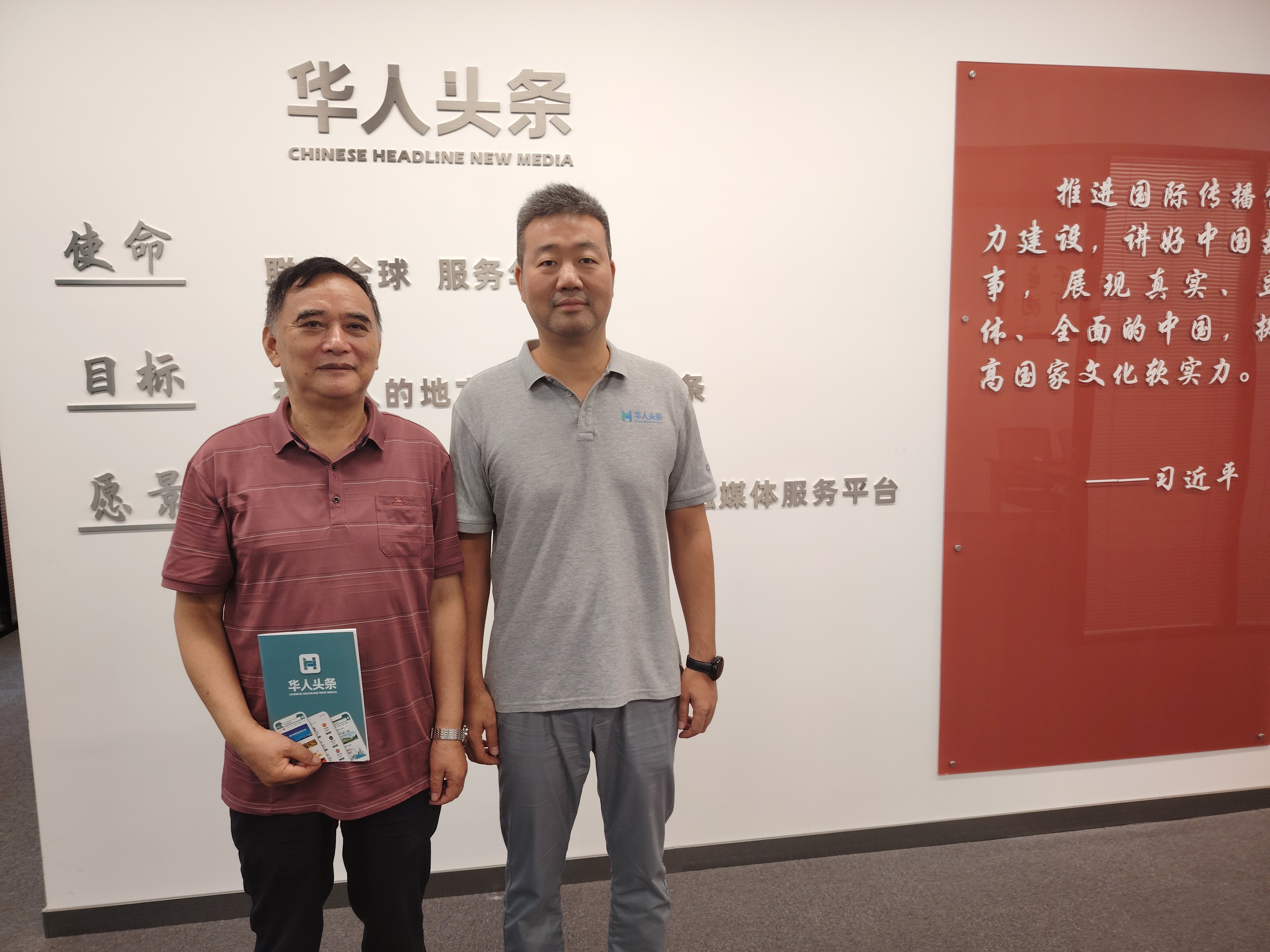 "华人头条"创办人黄其旺(右)在福州升龙大厦"华人头条"办公室与欧洲论坛报社社长刘文建(左)合影。