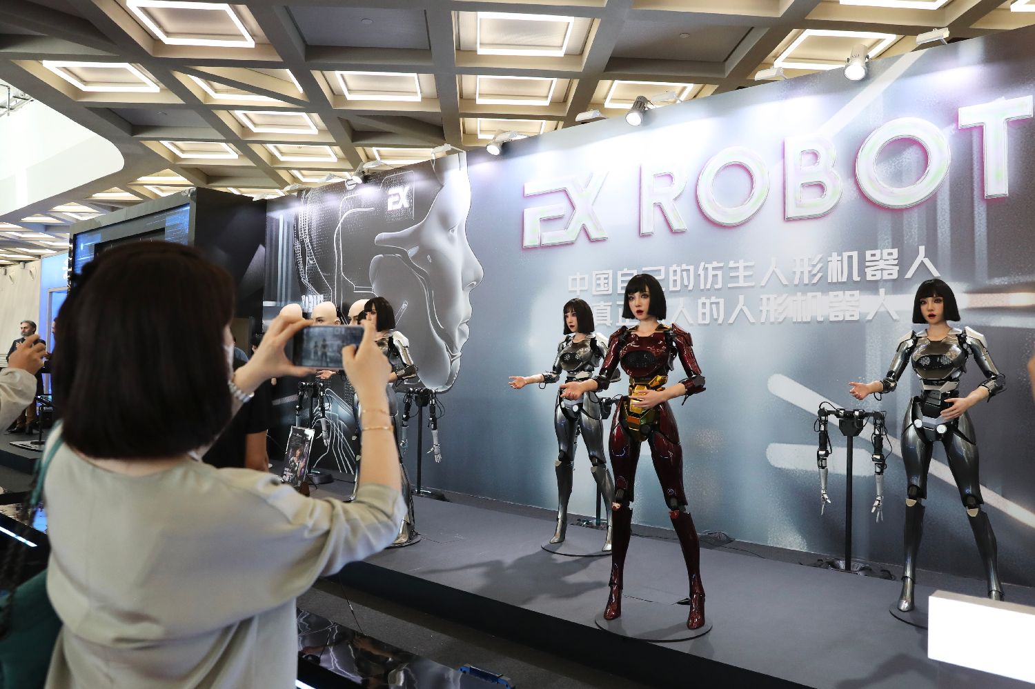 8月21日,2024世界机器人大会在北京开幕,大会以“共育新质生产力共享智能新未来”为主题。图为观众观看交互型仿生机器人演示。图/中新社