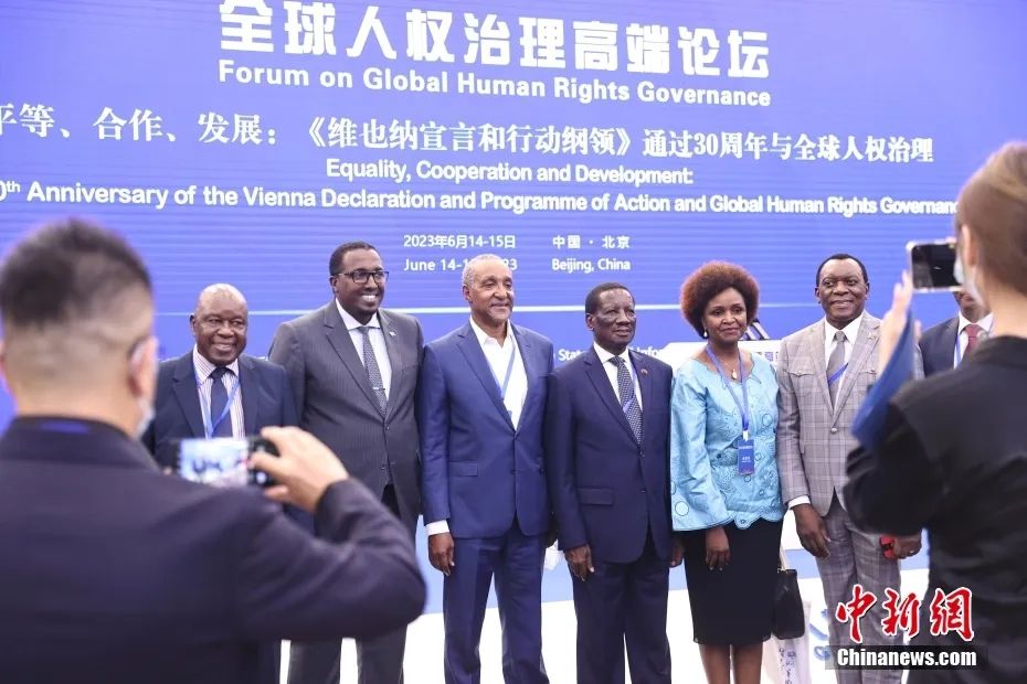 6月14日,全球人权治理高端论坛在北京举办。图为外方嘉宾在开幕式后合影留念。图/中新网