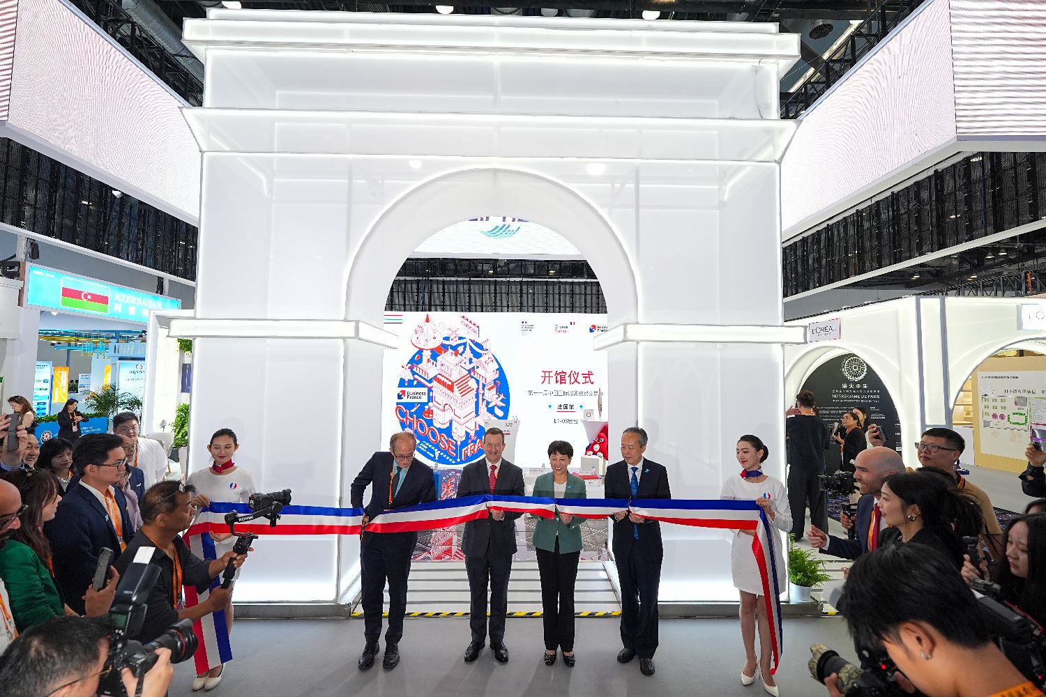 凯旋门、塞纳河上的比尔哈凯姆桥拱门、2024年巴黎奥运会和残奥会吉祥物“弗里热”等现身于本届服贸会主宾国法国设立的法国馆。