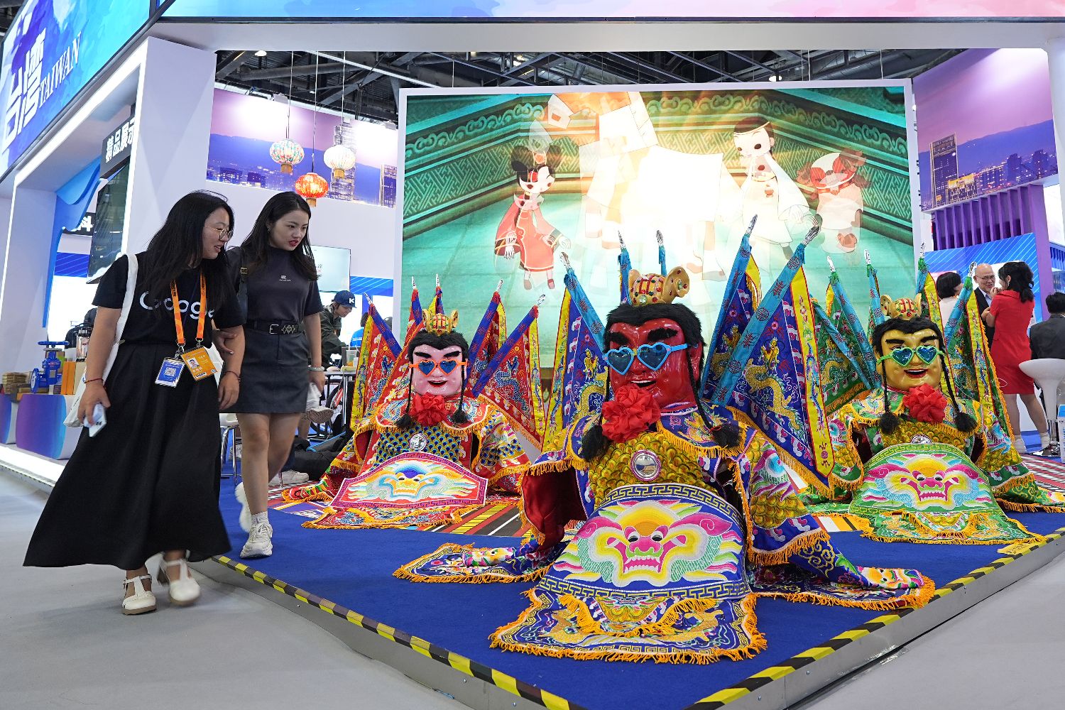 2012年以来,服贸会已成功举办十届,不仅成为深化服务贸易合作的平台,也为各地文化艺术搭建面向世界的舞台。开馆首日,“电音三太子”造型的皮影人在台湾馆登场,和木偶戏同台演出。