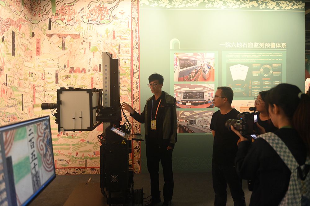 9月21日,在甘肃省敦煌市第七届丝绸之路(敦煌)国际文化博览会展馆内,游客参观敦煌研究院“典范”“高地”建设成果展中的第四代壁画高保真自动拍摄装置。图/中新社