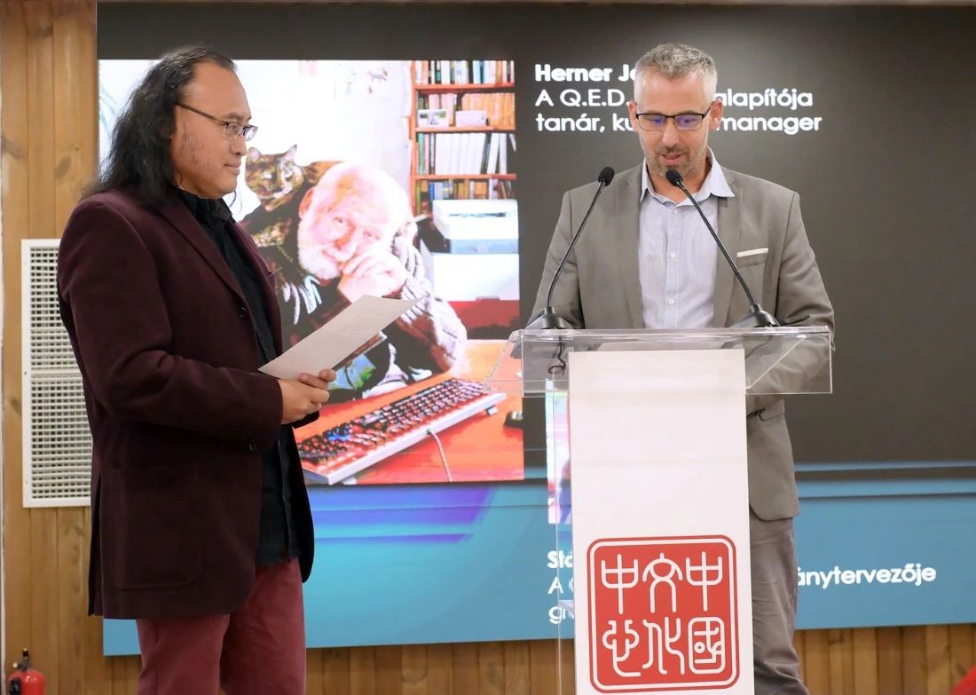 QED出版社海尔奈·丹尼尔代表出版社创始人、塞切尼国立图书馆副馆长海尔奈·亚诺什(Herner János)致辞,他回顾了自己参与出版的《道德经》《西游记》《中国年画集粹》等一系列匈牙利语版中国图书,并表示能够出版这些作品不仅是巨大的荣幸,也是有趣的冒险,通过出版可以越来越多地了解中华文明和文化。