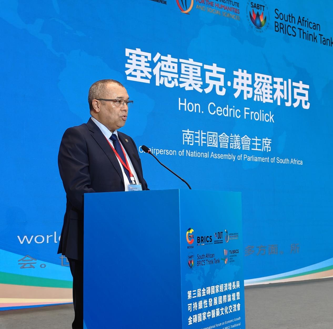 南非国会议会主席、金砖国家文化艺术国际合作委员会主席(BCICCA,简称金文委)塞德里克·弗罗利克(Cedric Thomas Frolick)致辞。