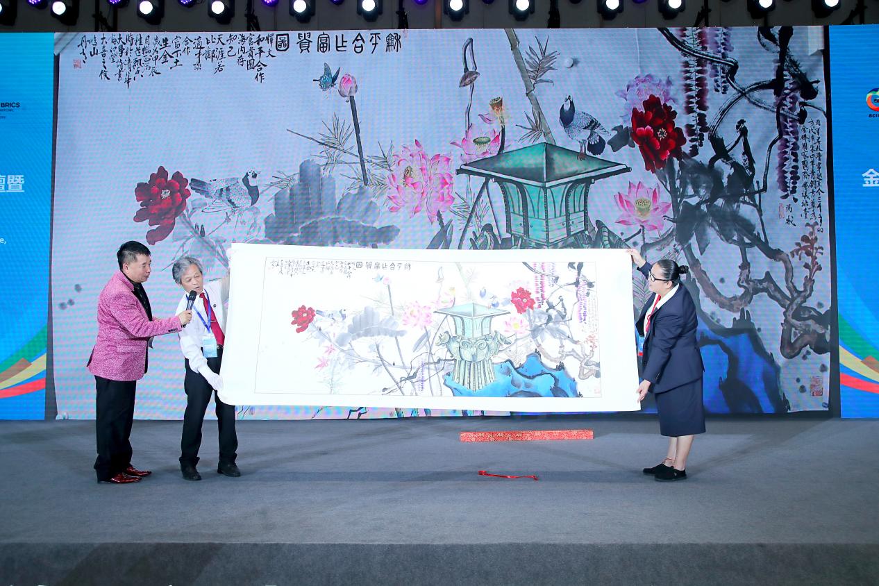 清华大学书画高研班导师侯峻山为论坛创造《和平合作富贵图》,展示中华五千年文明,表达和平合作的主题。