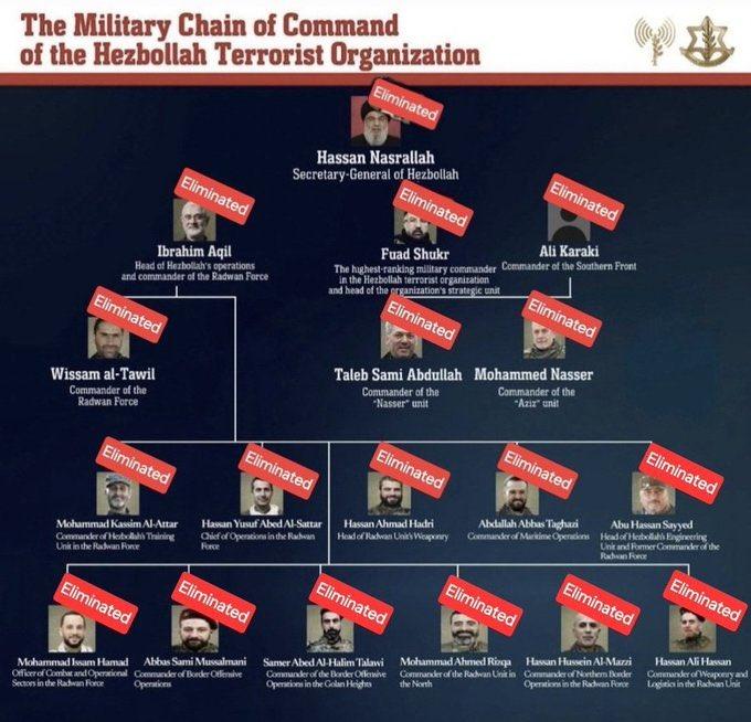 为了形象说明真主党遭到重创,以色列官方还发布了一张真主党死亡人物关系图。据称,至少已有18名真主党高级成员被打死。