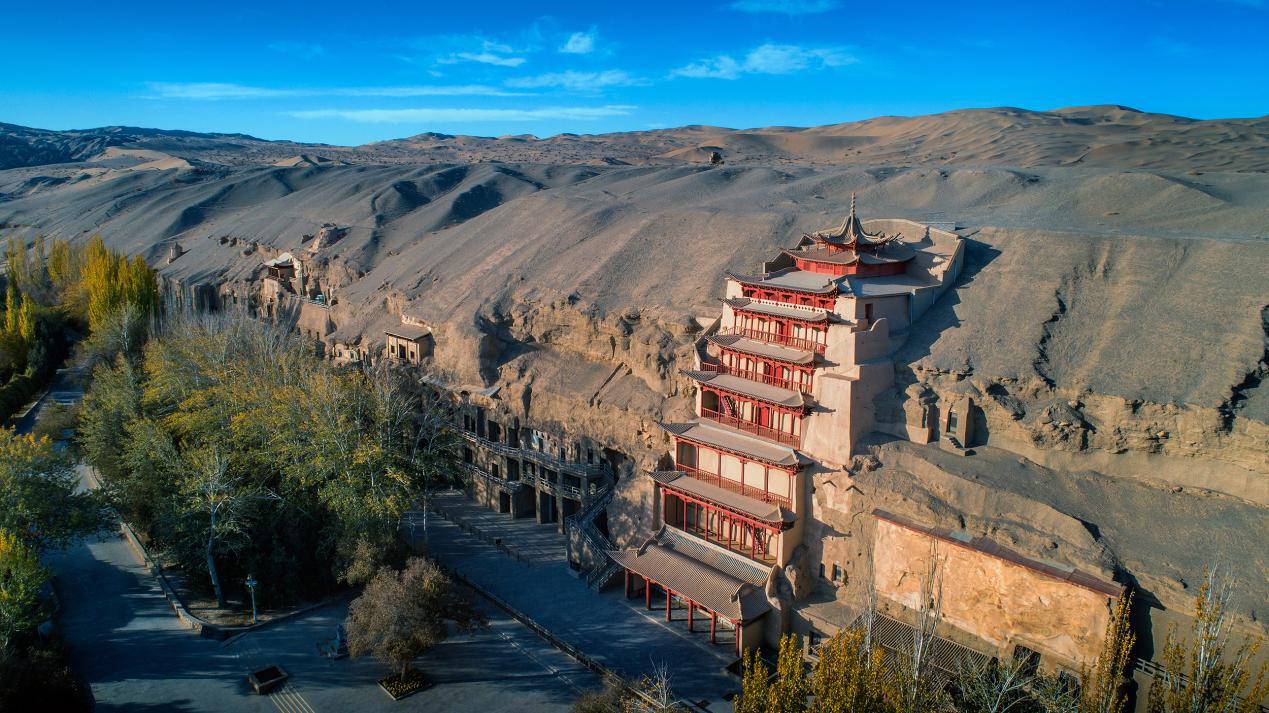 敦煌莫高窟标志性建筑“九层楼”。图/中新社