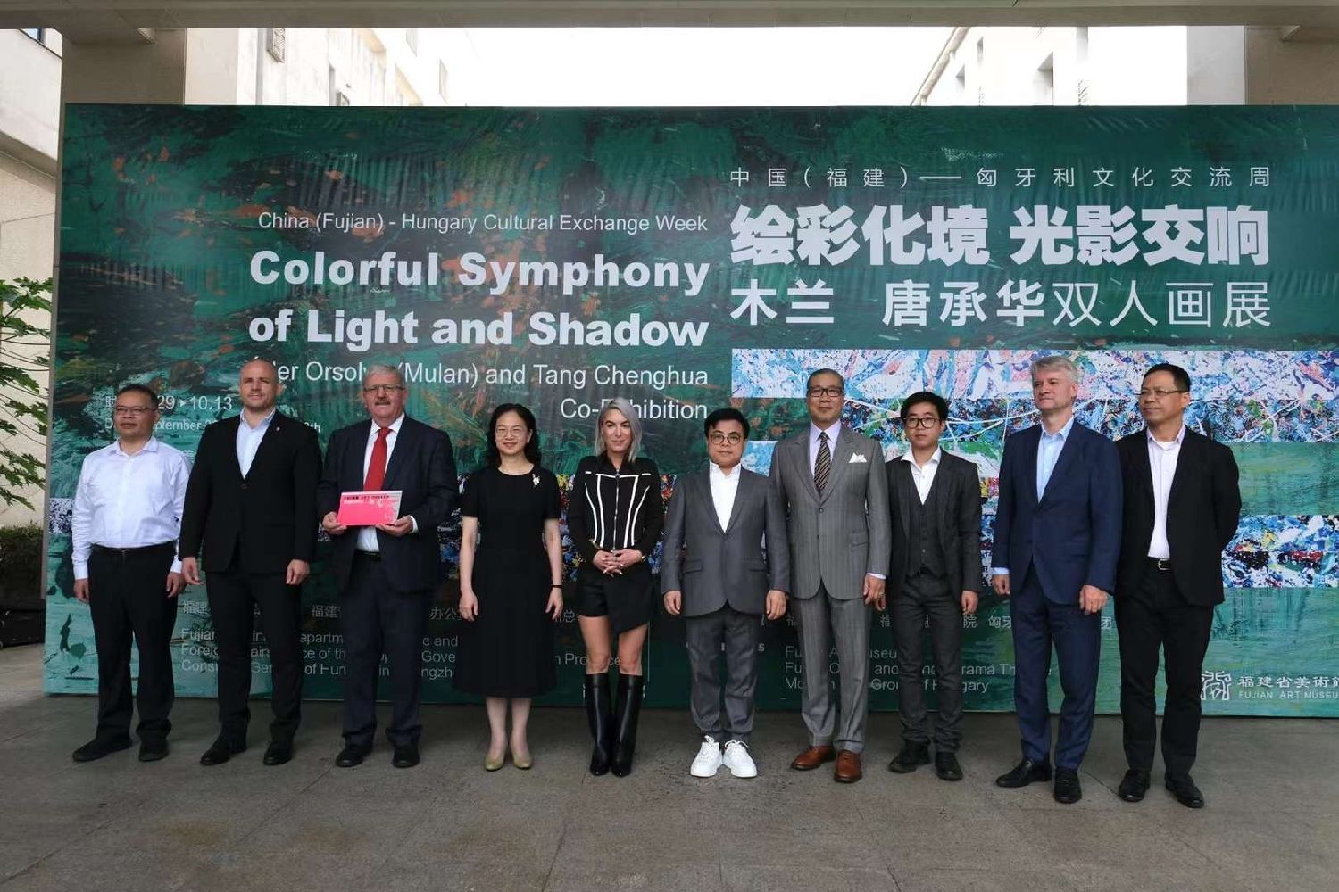 (图中左四为福建省副省长江尔雄,左三为匈牙利文化与创新部首席顾问提尔斯·托马斯,左二为匈牙利驻广州领事馆总领事华培德,左一为福建省文旅厅厅长张源生,右六为匈牙利青年艺术家木兰,右五为摩根斯达集团董事长郭国雄,右四为中央美术学院教授、闽籍艺术家唐承华,右三为香港维岸画廊行政总裁邓良军,右二为格德勒茜茜公主宫殿艺术总监阿莱克斯·西拉西,右一为摩根斯达集团副董事长徐晓武)