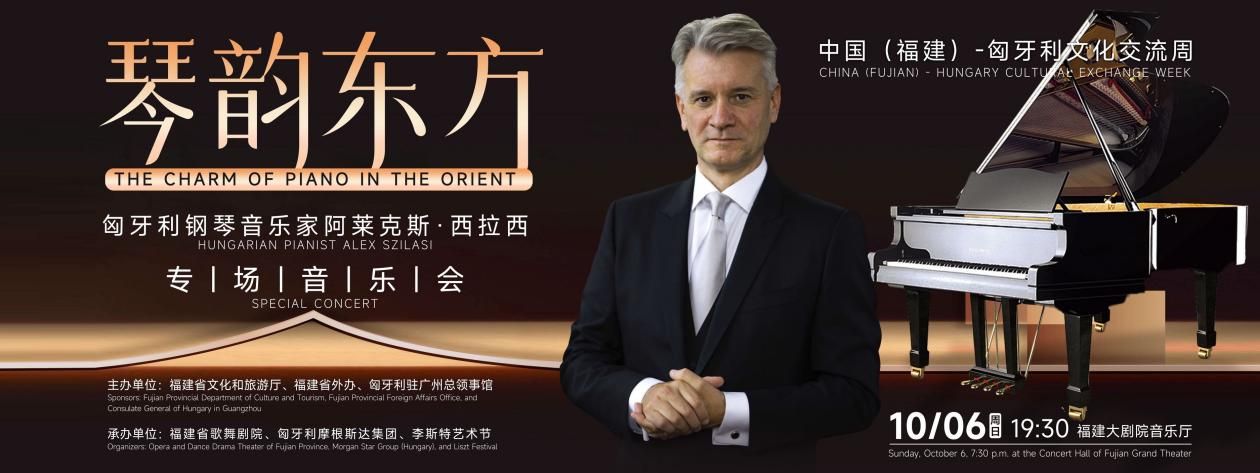 10月6日晚上,“琴韵东方”——匈牙利钢琴音乐家阿莱克斯·西拉西专场音乐会在福建大剧院音乐厅举行。“琴韵东方”——匈牙利钢琴音乐家阿莱克斯·西拉西专场音乐会由福建省文化和旅游厅、福建省外办、匈牙利驻广州总领事馆主办,福建省歌舞剧院、匈牙利摩根斯达集团、李斯特艺术节承办。