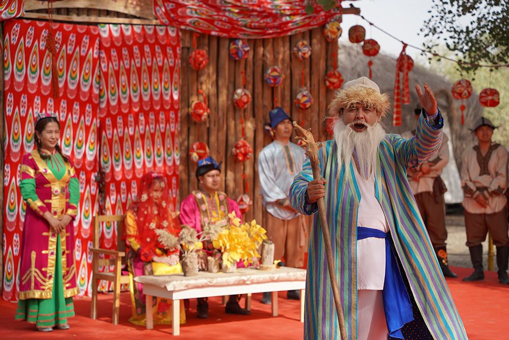 9月21日,新疆尉犁县罗布人村寨内正在上演罗布人婚礼民俗体验活动。图/中新社