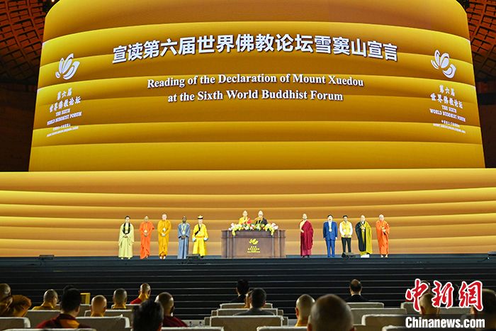 图为闭幕式上宣读第六届世界佛教论坛《雪窦山宣言》。中新社记者赵文宇摄
