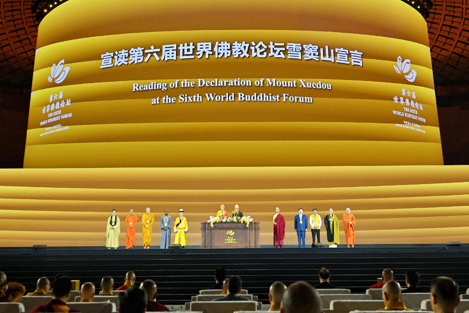 10月17日,第六届世界佛教论坛闭幕式在浙江宁波举行。图为闭幕式上宣读第六届世界佛教论坛《雪窦山宣言》。图/中新社