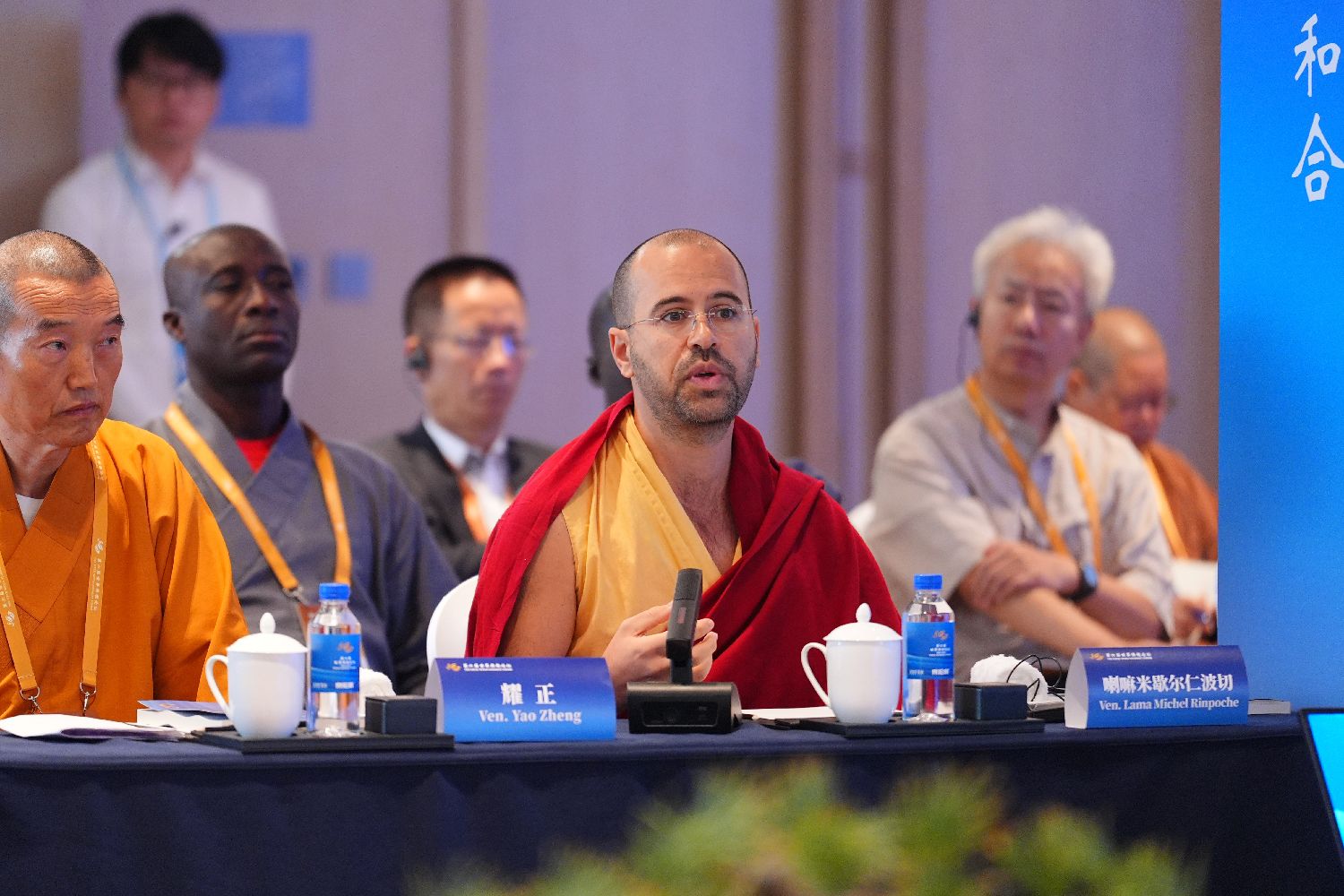 10月17日,第六届世界佛教论坛“焦虑与解压——佛教的欢喜精神”分论坛在浙江宁波举行。图为外国法师发言。图/中新社