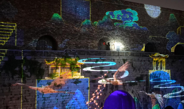 以南京明城墙最为著名的“天下第一瓮城”中华门为载体,引入了南京白局、戏剧、锣鼓、舞蹈、琴、阮、琵琶、马灯等多种非遗和传统文化元素,通过光影和实景的演绎,展现南京城墙厚重的文化历史。中华门《心印·中华门》沉浸式光雕,让白天“沉睡”于城市繁华之中的古明城墙,在夜色里绽放夺目光彩。