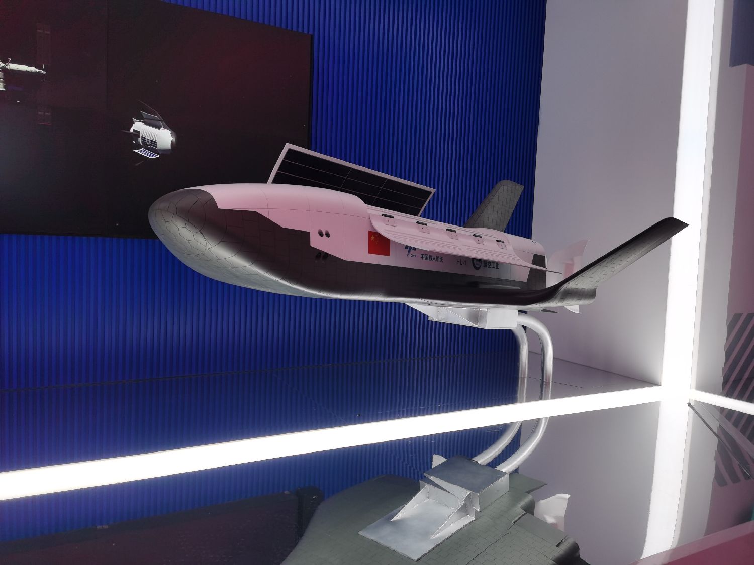 “昊龙”货运航天飞机模型将首次亮相第十五届中国航展,届时将在中国航空工业集团的商业空天展位进行全方位展示。图为11月10日,记者探馆时拍摄的“昊龙”货运航天飞机模型。图/中新社