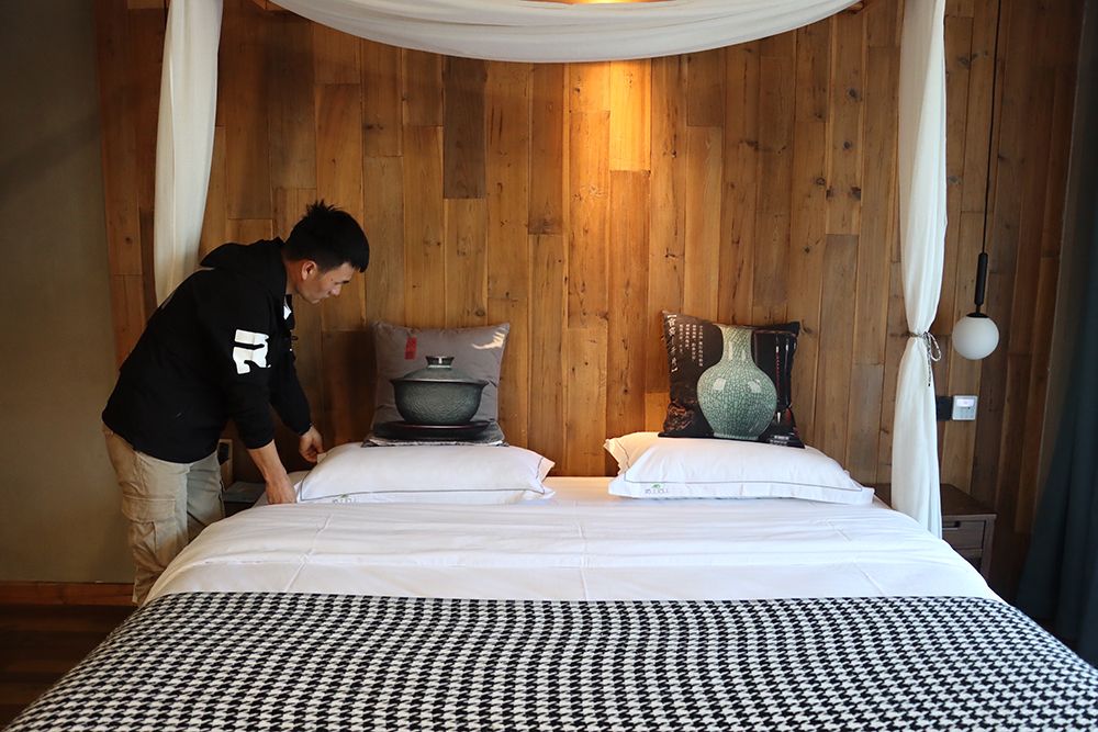 11月8日,浙江龙泉溪头村,叶柏青打理充满青瓷文化的房间。图/中新社