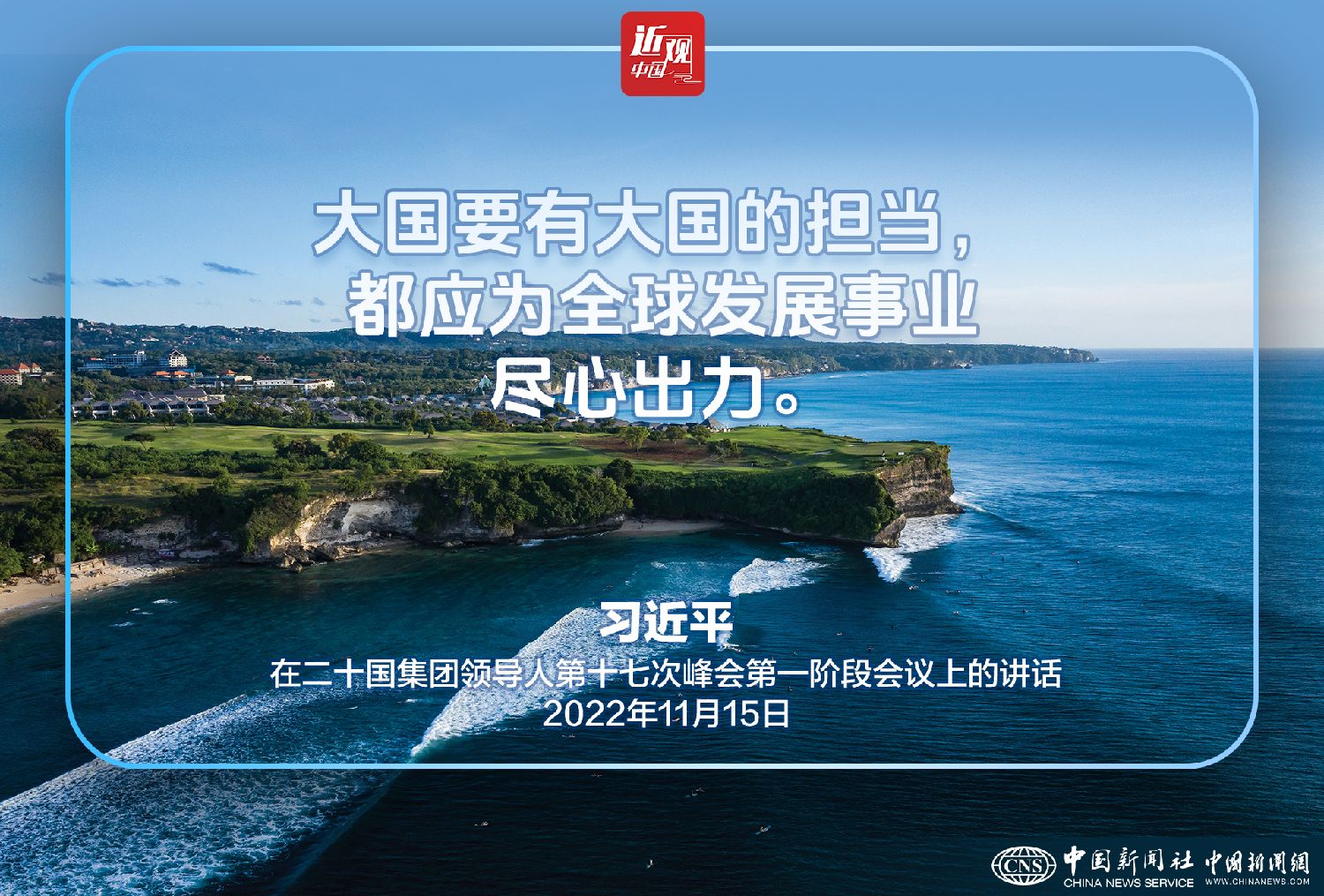 2022年11月15日,二十国集团领导人第十七次峰会在印度尼西亚巴厘岛举行。中国国家主席习近平出席并发表题为《共迎时代挑战共建美好未来》的重要讲话。