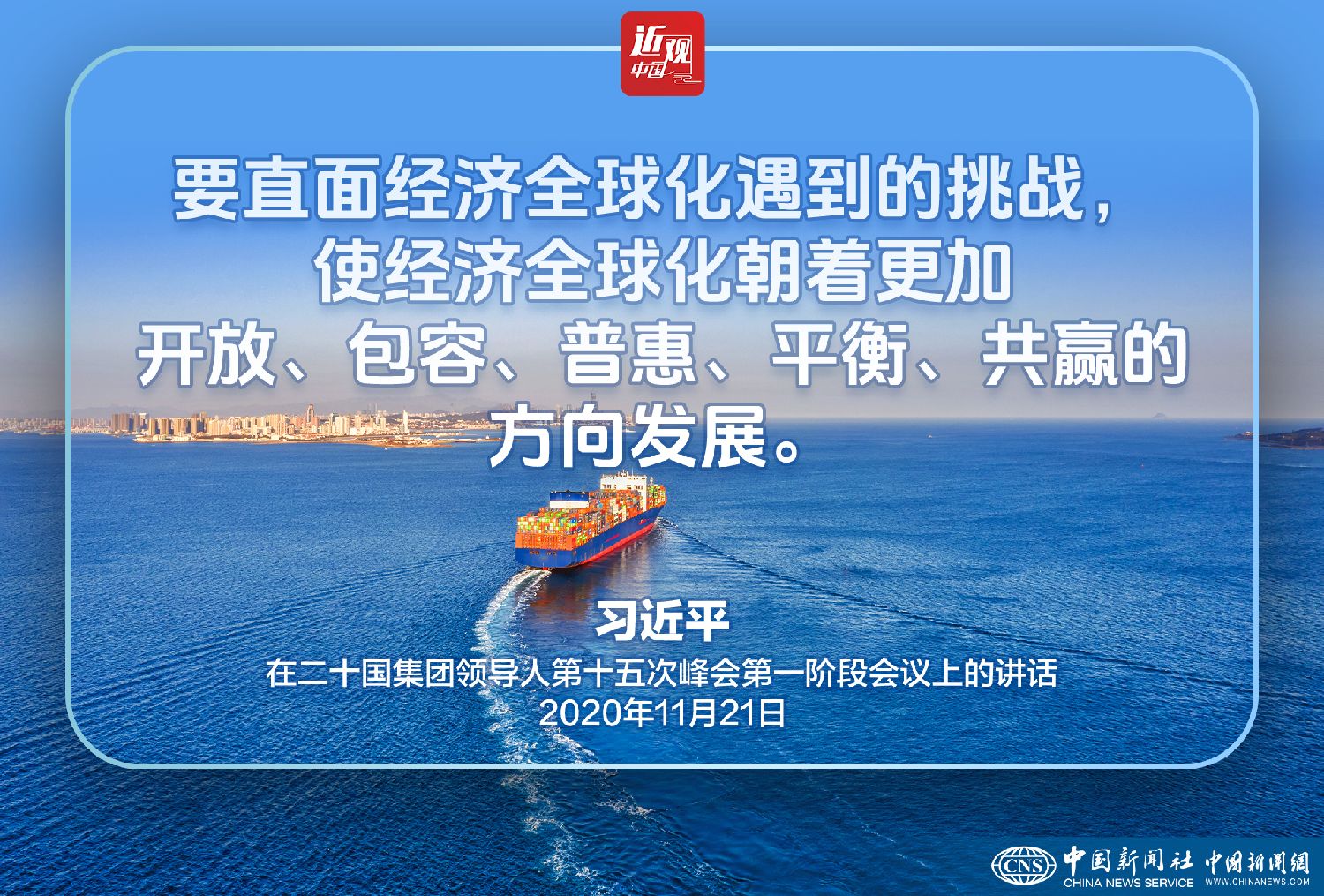 2020年11月21日晚,中国国家主席习近平在北京以视频方式出席二十国集团领导人第十五次峰会第一阶段会议并发表题为《勠力战疫共创未来》的重要讲话。
