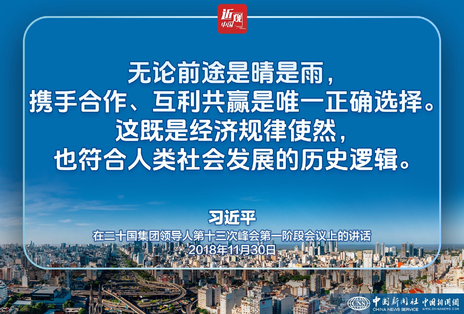 2018年11月30日,二十国集团领导人第十三次峰会在阿根廷布宜诺斯艾利斯举行。中国国家主席习近平出席第一阶段会议并发表题为《登高望远,牢牢把握世界经济正确方向》的重要讲话。