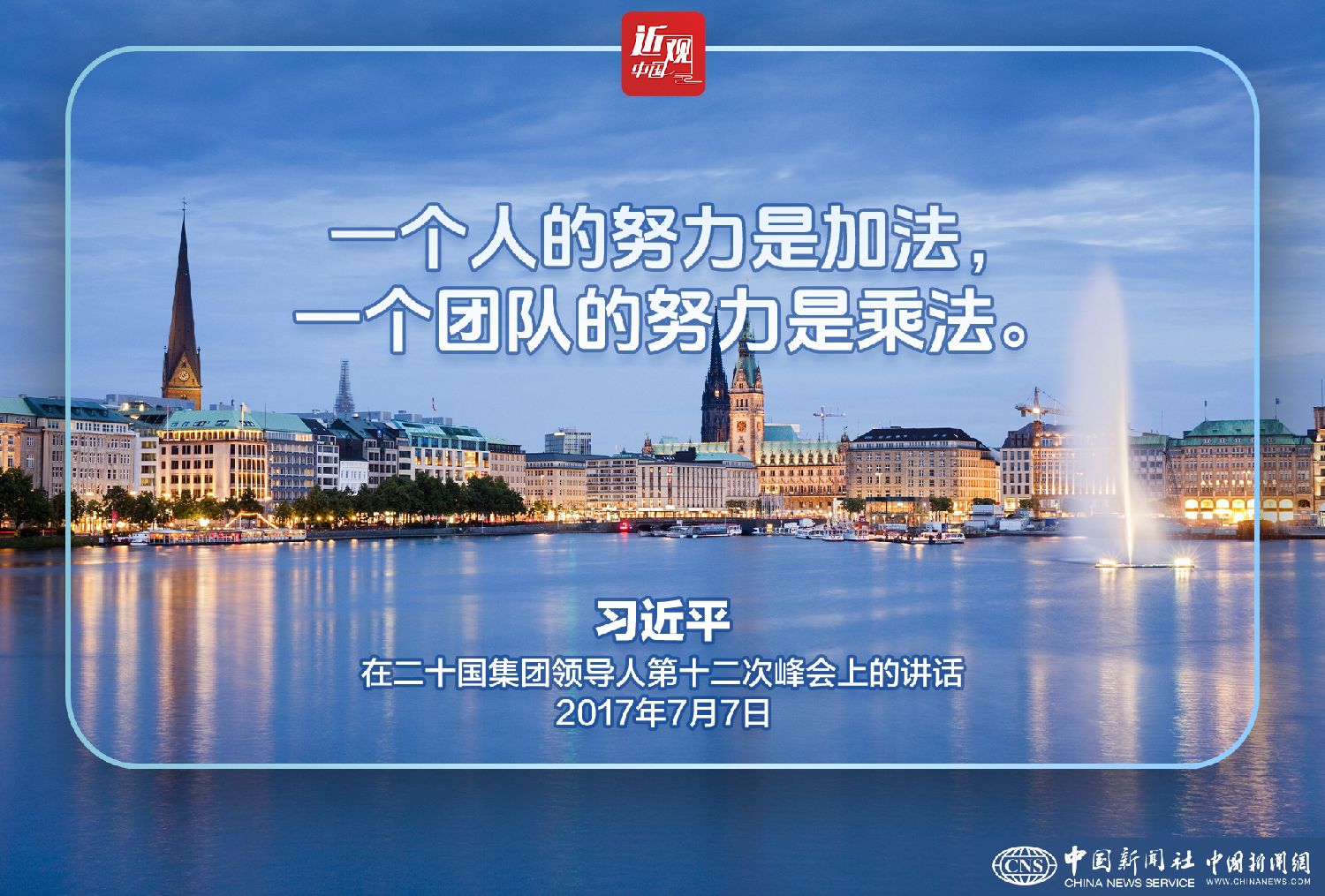 习近平表示,德国谚语说,一个人的努力是加法,一个团队的努力是乘法。让我们携手合作,推动联动增长,促进共同繁荣,不断向着构建人类命运共同体的目标迈进!