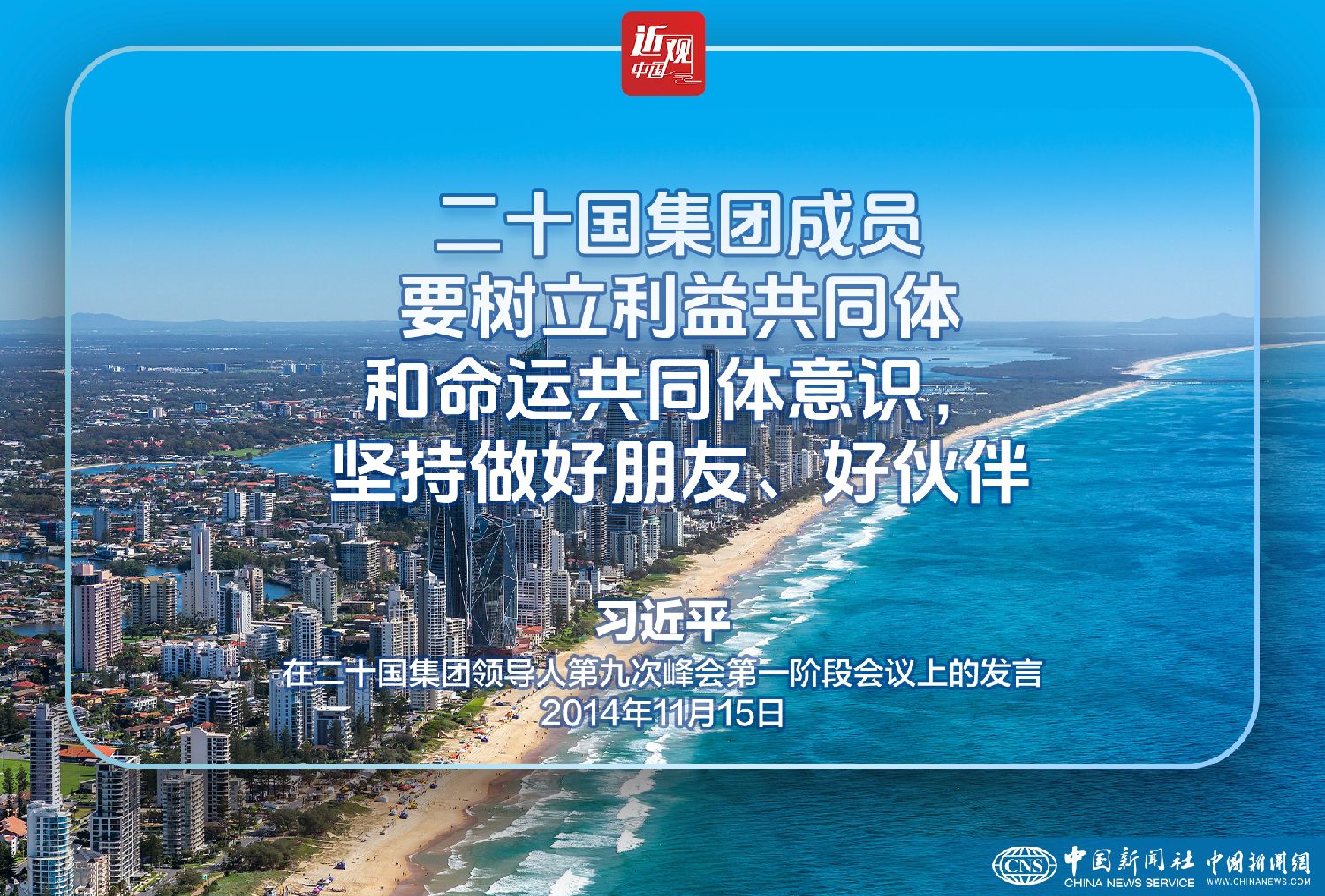 2014年11月15日,二十国集团领导人第九次峰会在澳大利亚布里斯班举行。中国国家主席习近平出席会议并发表题为《推动创新发展实现联动增长》的重要讲话。