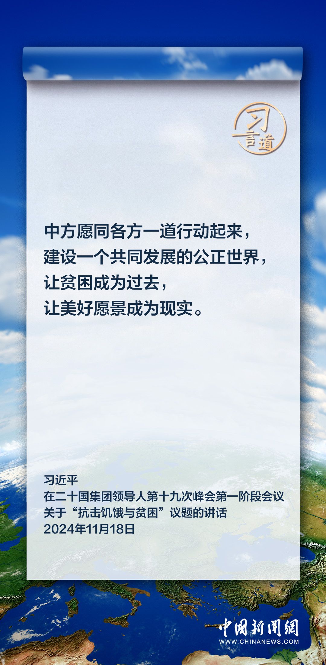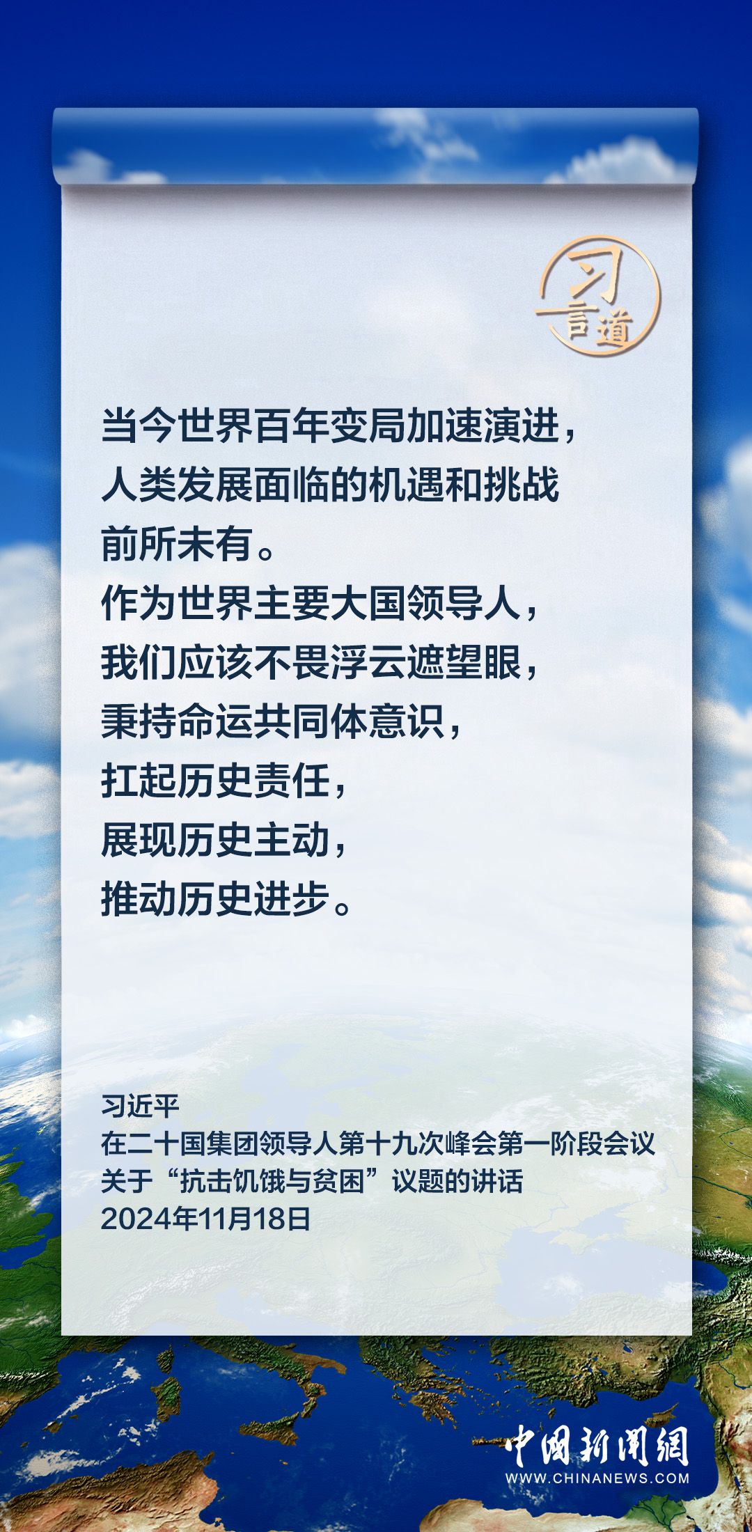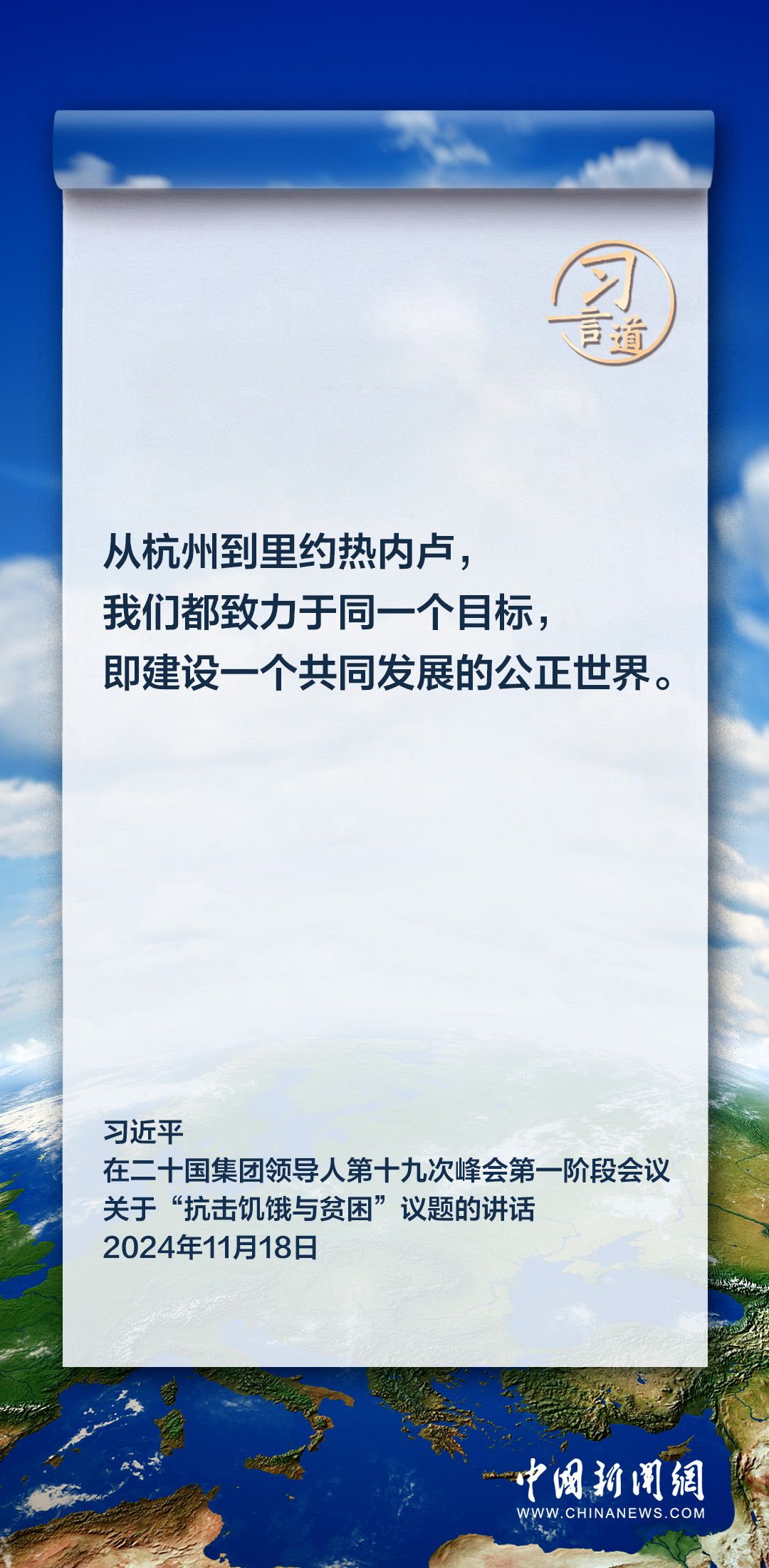 当地时间11月18日上午,国家主席习近平在巴西里约热内卢出席二十国集团领导人第十九次峰会。在峰会第一阶段围绕“抗击饥饿与贫困”议题讨论时,习近平发表重要讲话。