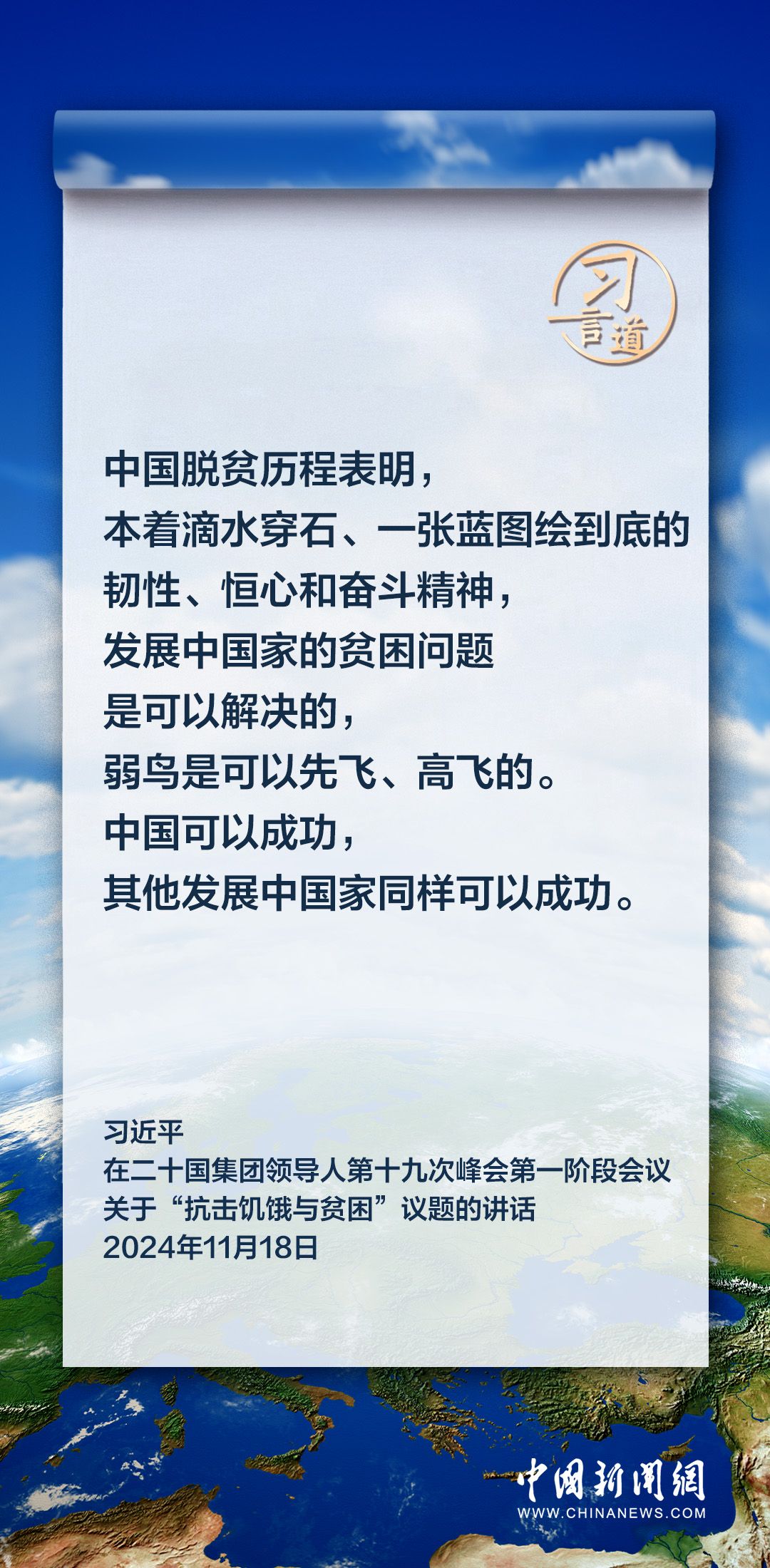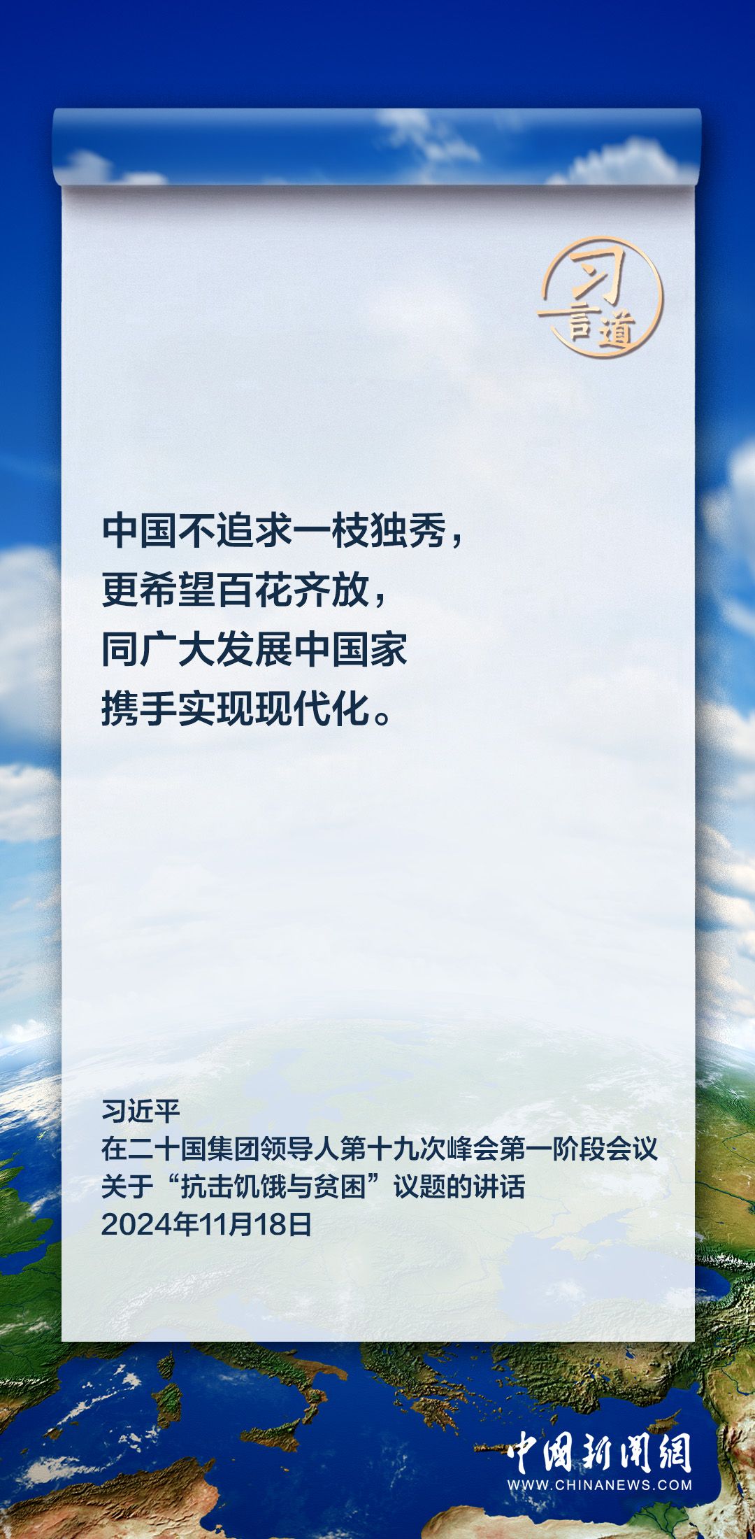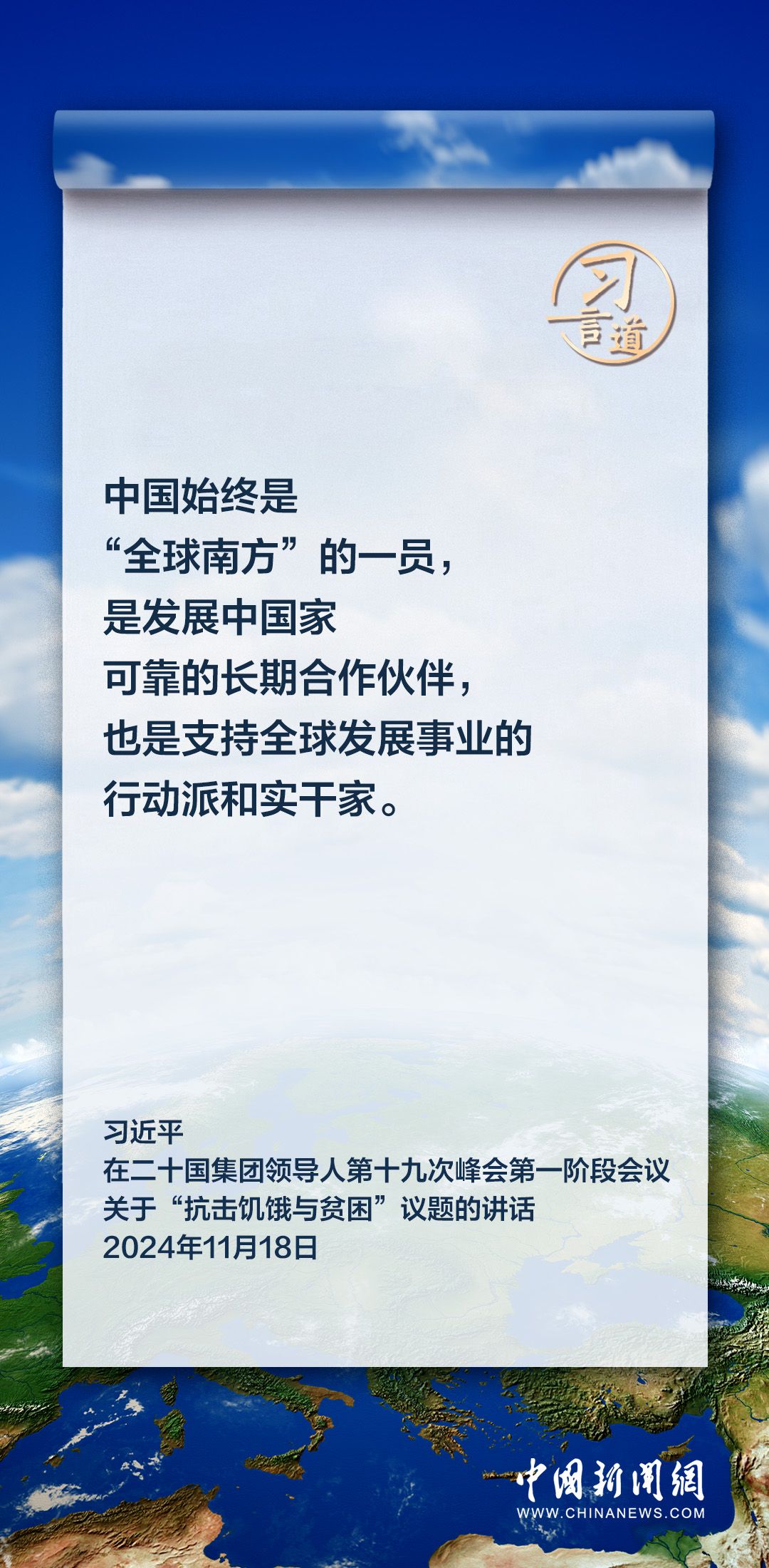 当地时间11月18日上午,国家主席习近平在巴西里约热内卢出席二十国集团领导人第十九次峰会。在峰会第一阶段围绕“抗击饥饿与贫困”议题讨论时,习近平发表重要讲话。