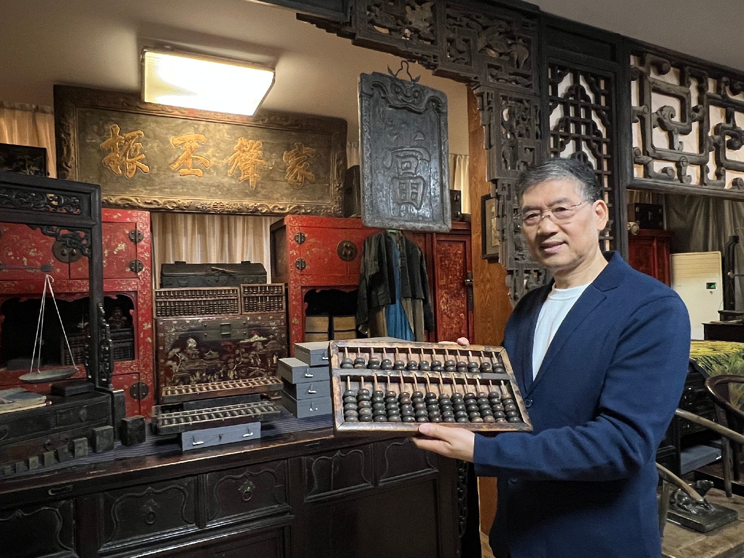 晋商学者、山西财经大学晋商研究院客座教授陈旭介绍自己收藏的算盘。图/中新社