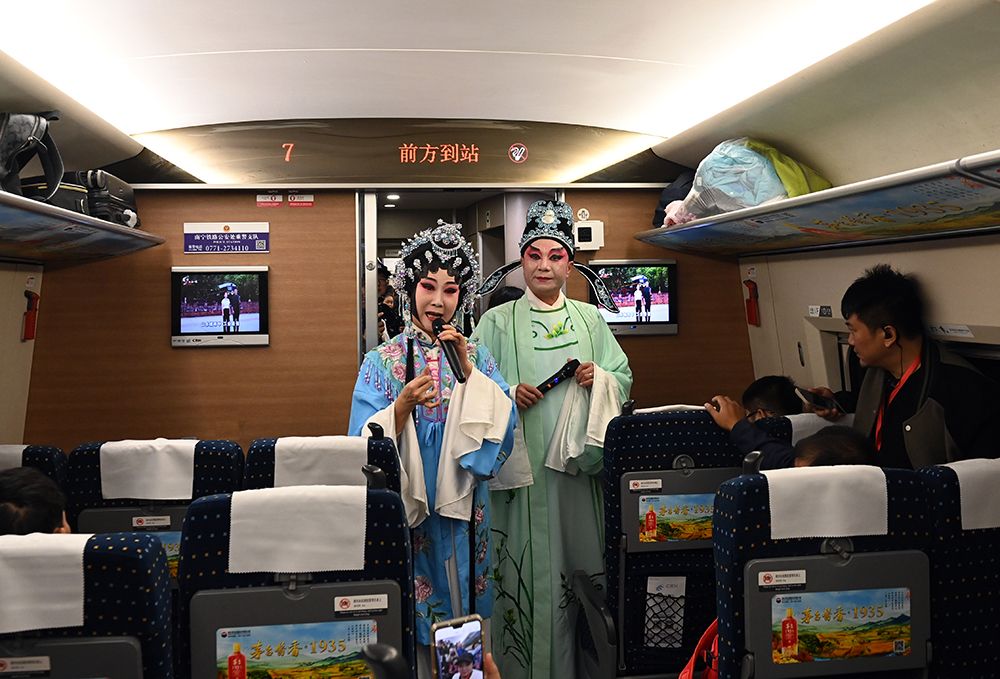 12月30日,玉林市粤剧演员在玉林开往南宁的首发动车上表演粤剧。图/中新社