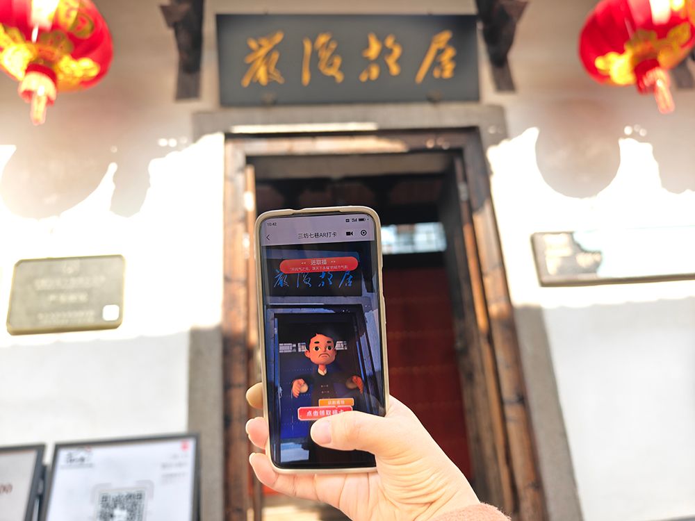 12月30日,在福建福州三坊七巷的严复故居前,一位游客正在“三坊七巷官方旅游平台”微信小程序上使用AR打卡。扫描严复故居外景后,Q版人物形象严复便映入眼帘,与之互动,并送上“福卡”。图/中新社