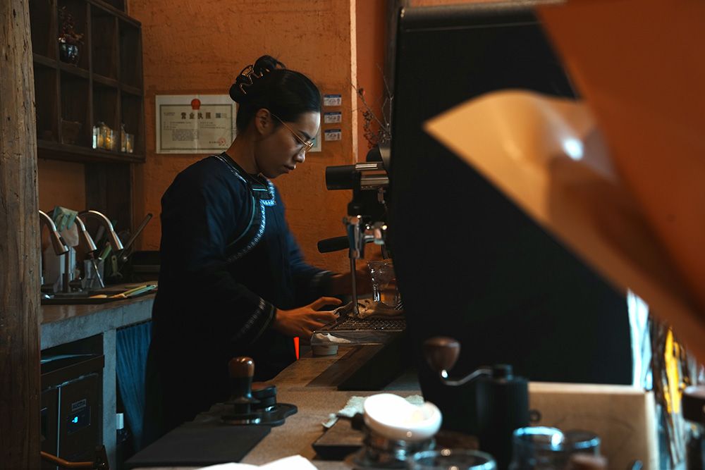 这位身穿侗族服饰的26岁青年,进入咖啡店的第一件事,就是打开咖啡机为自己制作一杯美式,“最近天气比较潮湿,给自己制作咖啡的同时可以观察咖啡机的萃取时间,以便调节咖啡豆的研磨粗细。”