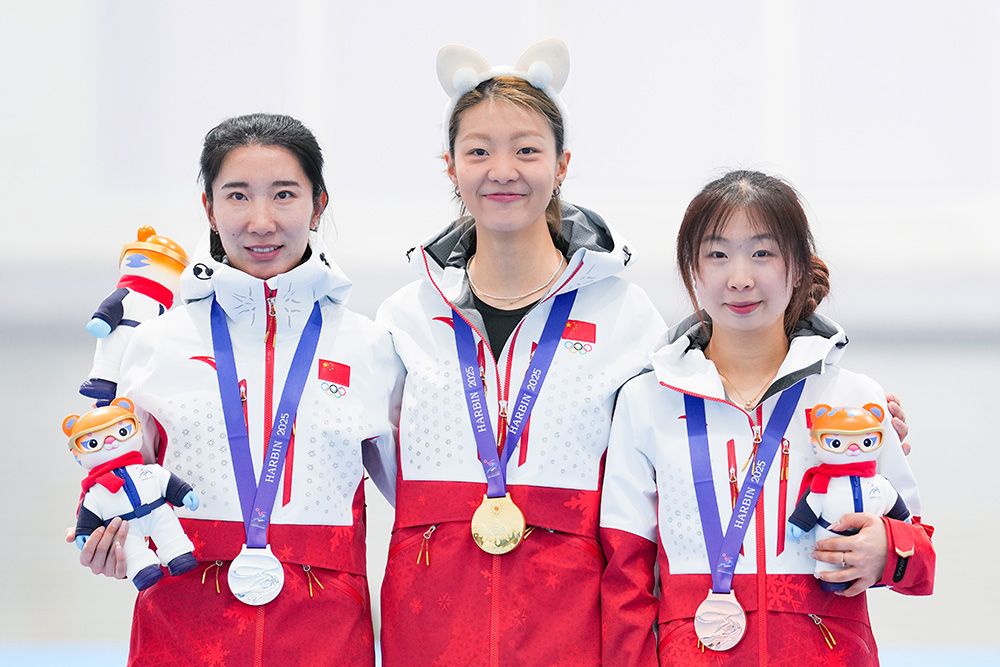 2月10日,在哈尔滨亚冬会速度滑冰女子3000米决赛中,中国选手杨滨瑜以4分08秒54的成绩夺冠,她的队友韩梅、太智恩分获亚军、季军。图为韩梅、杨滨瑜、太智恩(从左至右)在颁奖仪式现场。图/中新社