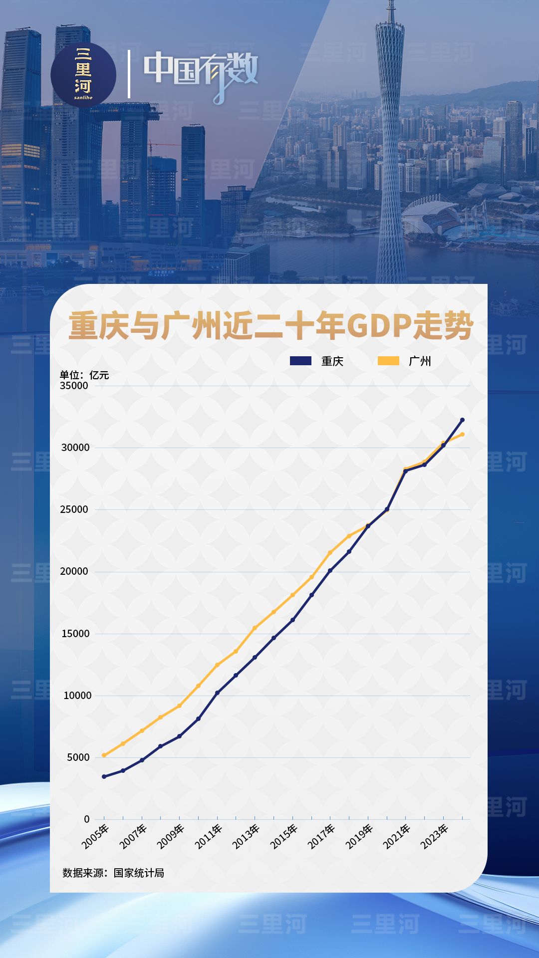 三里河注意到,2024年重庆和广州的GDP总量虽相差不多,但增速却拉开较大差距:广州增长2.1%,重庆则为5.7%。