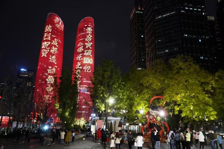 北京时间2月13日晚,四川成都,民众在位于成都交子大道的哪吒雕塑前拍照留念。当晚,成都天府双子塔亮灯,庆祝电影《哪吒之魔童闹海》总票房突破100亿元人民币。图/中新社