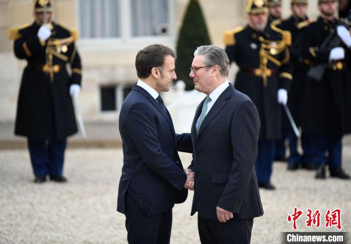 当地时间2月17日,欧洲主要国家领导人在巴黎会晤,商讨地区安全局势。图为法国总统马克龙在巴黎爱丽舍宫迎接英国首相斯塔默。 中新社记者李洋摄