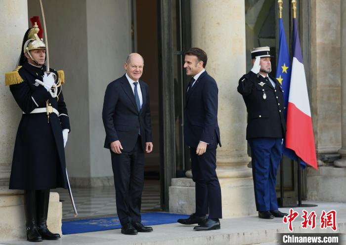 当地时间2月17日,欧洲主要国家领导人在巴黎会晤,商讨地区安全局势。图为法国总统马克龙在巴黎爱丽舍宫迎接德国总理朔尔茨。 中新社记者李洋摄