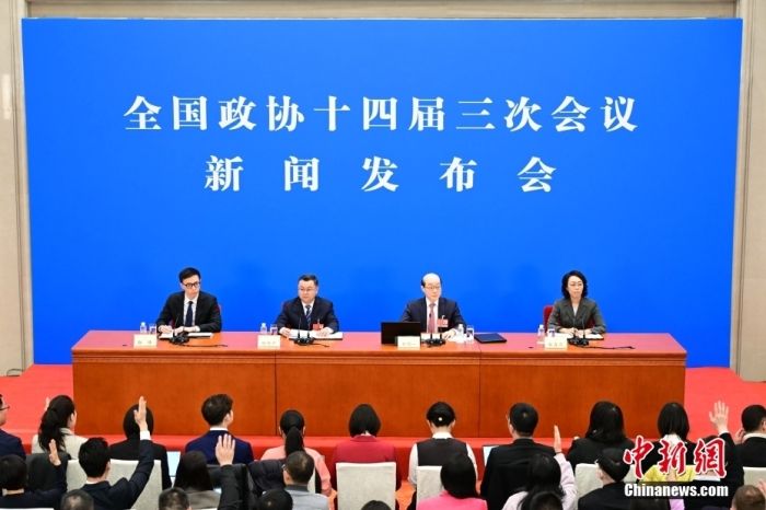 3月3日,全国政协十四届三次会议新闻发布会在北京人民大会堂举行。大会新闻发言人刘结一向中外媒体介绍本次大会有关情况并回答记者提问。中新社记者田雨昊摄