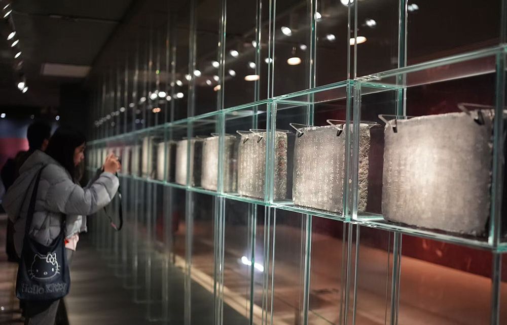 “墨韵文脉——甘肃丝路艺术珍品展”3月11日在中国美术馆开幕,图为观众正在欣赏明代的肃府本《淳化阁帖》刻石。图/中新社