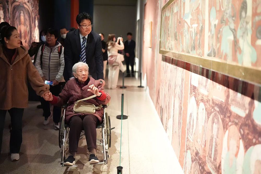 “墨韵文脉——甘肃丝路艺术珍品展”3月11日在中国美术馆开幕,图为艺术家常沙娜在现场参观。图/中新社