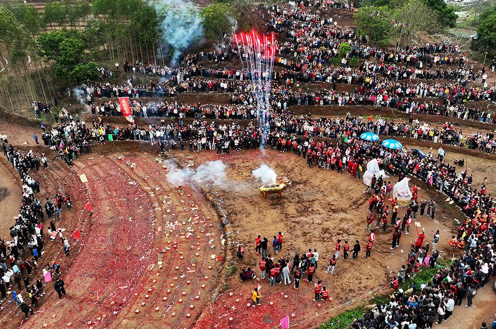 3月15日,广西南宁市邕宁区那楼镇举办民俗文化庙会暨福炮节庆典活动,吸引大批游客参与体验。图/中新社