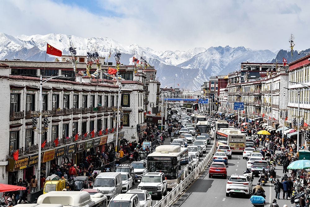2月21日,拉萨市中心热闹街景。图/中新社