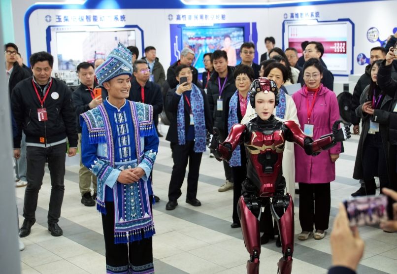 当天,宇树机器人亦忙个不停。身着“‘三月三’战袍”的宇树“六兄弟”,迈着舞步左右挥手、交叉摆臂、扭动身形,与广西街舞少年共同表演舞蹈秀《科目三》。在民族时尚秀版块,宇树“六兄弟”又忙着与广西织娘同场竞技,展现“最炫民族风”。