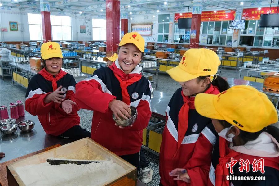 2023年10月13日,班戈县中石化小学六年级一班尼玛拉增(左二)在学校食堂捏糌粑,孩子们说她们的早餐便是以糌粑为主。图/中新社